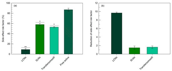 Evaluation of the side effect risk factor (panel (a)) (measured as the percentage of the minoxidil topically administered dose that did not reach the hair bulb) and the reduction of side effect risk factor (panel (b)) (measured as the ratio between the nanocarrier risk factor and that of the hydro-alcoholic formulation). The data obtained for minoxidil-loaded LCNs were statistically significant with respect to those obtained for SLNs, transfersomes® and the hydro-alcoholic formulation (* p < 0.05; ** p < 0.001).
