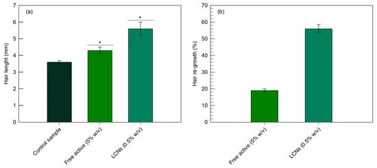 Evaluation of the re-growth effectiveness in rats following the treatment with the minoxidil-loaded LCNs or its hydro-alcoholic formulation. The re-growth efficacy was expressed both as measure of the hair length (panel (a)) and percentage of the hair length increase (panel (b)) in comparison with the control. The data obtained for minoxidil-loaded LCNs were statistically significant with respect to the control (* p < 0.001).