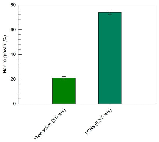 To reinforce the evidence of the biological effectiveness of minoxidil-loaded LCNs, in vivo experiments on an alopecia animal model were also carried out. These findings were in agreement with those reported in Figure 8, confirming the most suitable biological activity of minoxidil-loaded LCNs. Of note, in the animal model of alopecia (Figure 9), the minoxidil-loaded LCNs showed even greater biological activity than that observed in the above reported experiments, resulting in 74% of hair regrowth, when compared to the controls.