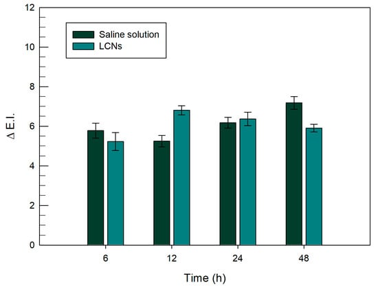 As shown in Figure 10, the obtained ∆EI values did not vary significantly for all timepoints, compared to the control (saline solution). A variation below 1.5 was recorded for all exposition times and this was probably related to the composition of the LCNs, which were made up of biocompatible ingredients. In fact, the main component, glycerol monooleate, was classified as GRAS (generally recognized as safe) and included in the FDA Inactive Ingredients Guide [52], reducing the probability of toxic events generally due to aggressive excipients such as surfactant mixtures.
