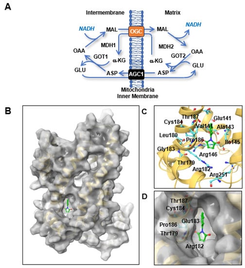 Recently, we reported that up to 80% of the total ATP production in melanoma and lung cancer cells [1], and about 40% of the ATP production in pancreatic cancer cells [2,3], depends on cytosolic NADH and the malate-aspartate shuttle (MAS). The MAS transfers cytosolic NADH into mitochondria for ATP production through oxidative phosphorylation (OxPhos) in the mitochondrial membrane [1]. The MAS consists of four metabolic enzymes, glutamic-oxaloacetic transaminase (GOT) 1 and 2 and malate dehydrogenase (MDH) 1 and 2, and two antiporters, oxoglutarate carrier (OGC, oxoglutarate/malate antiporter, SLC25A11) and mitochondrial aspartate-glutamate carrier (AGC1) (Figure 1A) [1,4]. Knock-down of OGC reduced ATP production by 80% and inhibited the growth of lung and melanoma cancer cells by over 90% [1]. ATP depletion by more than 50% induces cell cycle arrest and cell death in a time-dependent manner in cancer cells [5,6,7,8]. Furthermore, in in vivo experiments, heterozygous OGC knock-out mice showed 50% less spontaneous tumor development in the KRASLA2 lung cancer model [1]. Blocking OGC may selectively inhibit cancer growth by reducing ATP production in cancer cells because cancer cells rely on the MAS for ATP generation while normal cells do not [1,2].