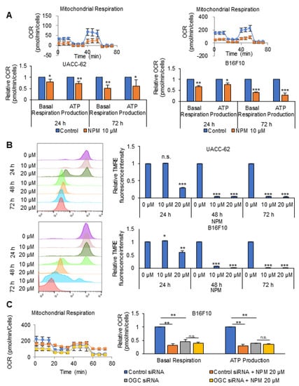 NPM reduced ATP production by decreasing the OCR and the mitochondrial membrane potential. (A) OCR was measured in UACC-62 and B16F10 cells treated with 10 µM of NPM for 24 h and 72 h using a Seahorse XFe96 analyzer. (B) The mitochondrial membrane potential was determined by tetramethylrodamine ester (TMRE) staining in UACC-62 and B16F10 cells treated with 10 or 20 µM of NPM for the indicated times. (C) The OCR and ATP production were analyzed by Seahorse XF analyzer after treatment of wild-type or OGC knock-down B16F10 cells with 20 µM of NPM for 24 h. Data represent the mean and standard deviation of three independent experiments. * p < 0.05, ** p < 0.01, and *** p < 0.001 compared with the vehicle control.