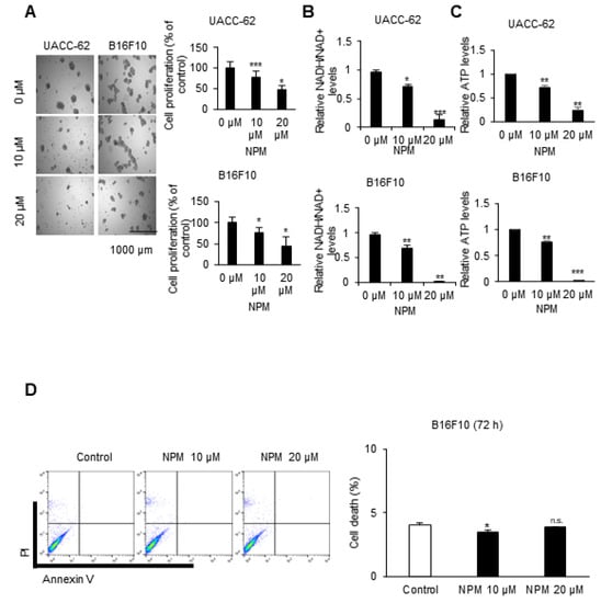 Cancer cell proliferation was regulated by NPM. (A) Cancer cell proliferation was determined by SRB assay in UACC-62 and B16F10 TSs treated with the indicated concentration of NPM for 72 h. (B) The NADH/NAD+ ratio was measured in UACC-62 and B16F10 cells treated with the indicated concentration of NPM for 72 h. (C) The ATP level was measured using luminescent ATP assay kit in UACC-62 and B16F10 cells following to the treatment of NPM for 72 h. (D) Cell death was determined by annexin V and propidium iodide (PI) staining in B16F10 cells treated with 10 and 20 µM NPM for 72 h. Data represent the mean and standard deviation of three independent experiments. * p < 0.05, ** p < 0.01, and *** p < 0.001 compared with the vehicle control.