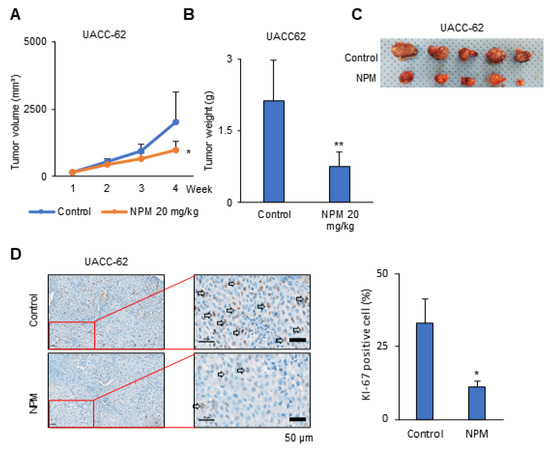 We observed an antiproliferative effect of NPM in cancer cells, as shown in Figure 3. To test whether NPM has anticancer effects on melanoma in vivo, NPM was administered in a mouse xenograft model using the human UACC-62 cell line (Figure 4). The maximum tolerated dose of NPM was determined to be 60 mg/kg/day (PO: per os, oral treatment) (Supplementary Figure S1). Three weeks of treatment with NPM reduced the UACC-62 tumor volume to about 50% of the control group (Figure 4A,C). Tumors were collected at the end of the in vivo experiment and tumors were weighed. The tumor mass in the NPM treatment group was reduced by 63% compared with the control group (Figure 4B). Immunohistochemical staining for Ki67, a marker of proliferation, was strongly reduced by NPM treatment. NPM treatment reduced the percentage of Ki67-positive cells by 67% compared with the control (Figure 4D).