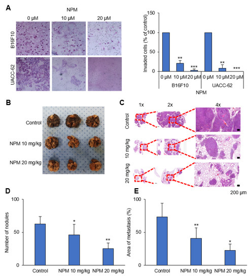 NPM reduces lung metastasis of B16F10 melanoma cells in immunocompetent mice. (A) Invasion assay performed with B16F10 and UACC-62 cell lines following NPM treatment for 16 h. Representative images of the invasion assay using B16F10 and UACC-62 cells (left). The numbers of invasive B16F10 and UACC-62 cells were measured using ImageJ (right). (B) Representative photographs of formalin-fixed lungs. (C) Metastatic lesions were observed with hematoxylin and eosin (H&E) staining. (D) Statistical analysis of the number of metastatic nodules. (E) Statistical analysis of the total metastatic area using ImageJ. Data represent the mean and standard deviation of three independent experiments. * p < 0.05, ** p < 0.01, and *** p < 0.001 compared with the vehicle control.