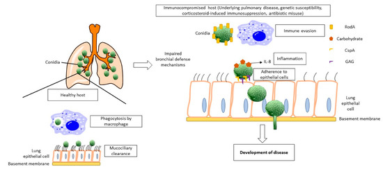 One can become infected by Aspergillus spp. when conidia released into the atmosphere are inhaled and deposited in the respiratory tract. These small diameter (3–5 µm) conidia are usually cleared by the bronchial and innate defense mechanisms of the immunocompetent hosts without underlying pulmonary disease [15,20]. However, through inevitable repeated respiratory exposure to the conidia, these conidia will eventually penetrate into the alveolar spaces resulting in saprophytic colonization in the lung cavities and damaging the surrounding parenchyma. Colonization of the conidia is promoted by some Aspergillus factors, which include the surface protein RodA, carbohydrates, GPI-anchored protein CspA, exopolysaccharide galactosaminogalactan and extracellular proteases. These features allow Aspergillus spp. to persist in the airways while evading destruction by the immune system (Figure 2). On the other hand, host factors that promote Aspergillus colonization include underlying immune response abnormalities, pulmonary disease, genetic susceptibility, antibiotic misuse, and corticosteroid treatment [21,22]. Fungal colonization will ultimately lead to the development of the disease, which manifests as a localized inflammation response, pleural thickening, parenchymal fibrosis, expansion of the colonized cavities with or without the formation of aspergilloma, the fungal growth detached from the cavity wall [20].