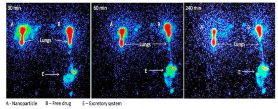 Gamma scintigraphy showing that 4 h post administration of free voriconazole accumulated in the excretory system whereas VNP remained in the lungs [64].