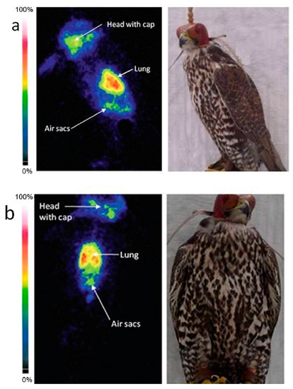 A gamma-camera image of a falcon after inhalation of the developed ITZ-NLC formulation from (a) the lateral side and (b) from dorsal side [79].