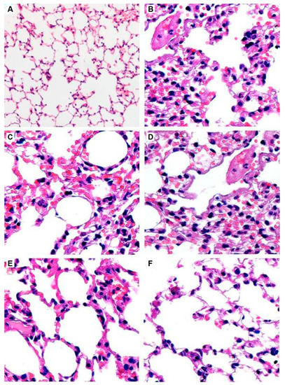 Section (A) shows normal lung tissues without any infection. Section (B) shows interstitial oedema in the lung tissues of C. albicans infected mice with yeast-like organisms after staining with haematoxylin and Periodic acid–Schiff. Section (C) and (D) showed the lung tissues of C. albicans infected mice after receiving phosphate-buffered saline and empty PLGA-TPGS NP which had comparable observation to the section (B). Section (E) and (F) shows lung tissues of C. albicans infected mice after treated with free AmB and AmB-NP respectively. Both lung tissues showed improvement compared to the untreated lung tissues; improvement after treatment of AmB-NP is more obvious [102].