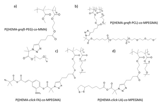 Structures of poly(ethylene glycol) (PEG) graft copolymer (a), PEG/poly(ε-caprolactone (PCL) co-graft copolymer (b) and conjugates of PEG graft copolymer (c,d).