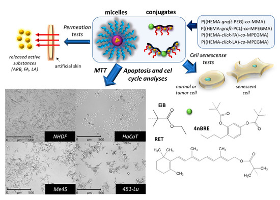 We focused on the biological evaluation of polymer delivery systems of active substances in cosmetology. As we reported earlier, novel polymeric carriers based on amphiphilic polymers were synthesized by a controlled radical polymerization and “click” chemistry reaction, to afford PEG grafted and PEG/PCL co-grafted polymethacrylates [23,24]. These polymers showed the ability to self-assemble into micellar structures and encapsulate substances, such as arbutin (ARB). PEG graft polymers were conjugated with ferulic acid (FA) and lipoic acid (LA) [25]. An additional benefit of these polymers is the presence of retinol or 4-n-butylresorcinol as the terminal or center unit in the main chain, as it was also postulated for linear polymethacrylates [26,27]. Previous studies on the physicochemical properties and release kinetics have appeared to be attractive for their potential application in the skin treatment. Thus, these new polymethacrylate carriers required biological evaluation as the supplementary characteristics, to confirm their safe activity in the dermal application. The permeability of the active substance release through a membrane mimicking the skin was tested by transdermal tests in Franz diffusion cells. Due to the unique construction of the Franz cells, it is possible to monitor the movement of the substance from the donor chamber (surrounding area) through the membrane as the artificial skin to the acceptor chamber (organism). Moreover, the response of these new polymer systems was assessed by their exposure to the selected cell lines, including normal human dermal fibroblasts (NHDF), and human epidermal keratinocyte (HaCaT), as well as cancer melanoma (Me45), and metastatic the human melanoma cell line (451-Lu) as the problematic skin. The results were achieved by the use of cell cycle test as well as MTT, Annexin-V apoptosis assays, and senescence tests, which determine the occurrence and type of cell death.