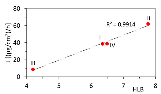 The flow rate through the membrane (J), which defines the kinetic efficiency of diffused substance, increased with increasing HLB that represents the hydrophilic fraction in the graft copolymer forming the carrier (Figure 4). Therefore, the lowest flow rate through the membrane, which corresponded to the longest release time (4 h), was obtained for III, which had the lowest HLB coefficient (4.19). However, for II and IV with HLB ≥ 6.5, they were much more functional systems in terms of the flow rate, and they supported high percentage amount of unreleased substance (NR = 40–50%).