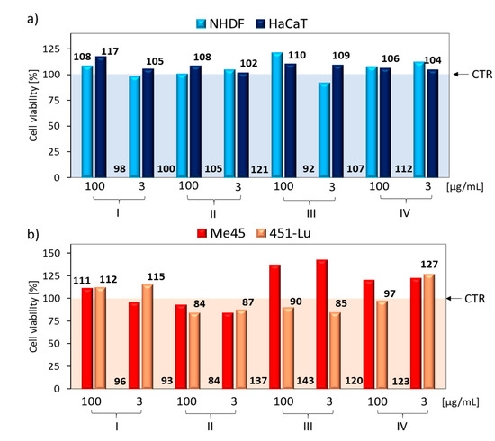 Comparison of in vitro cytotoxicity effects of carriers at higher (100 µg/mL) and lower (3 µg/mL) concentrations in exposure to (a) healthy cell lines, and (b) melanoma cell lines, where CTR—the control sample viability set to 100% as a baseline for cell viability calculations with the carrier.