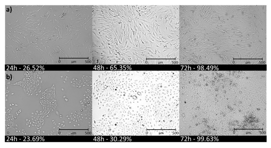 Exposure of NHDF and HaCaT cell lines to carriers caused a significant increase in cell confluence after a 72 h incubation as compared to control cells (CTR, Table 4). The type of compound used did not affect the confluence level for the HaCaT cell line; however, for the NHDF cell line, the highest confluence was obtained for the FA conjugate (~100%) and the lowest for the LA conjugate (~65%). The concentration (100 µg/mL vs. 3 µg/mL) did not affect cell confluence and additionally confirmed the non-toxicity of these carriers. Under the influence of the used PEG graft polymers, cells do not die and can proliferate. Clear increases in cell confluences after 24 h, 48 h, and 72 h are shown in Figure 6. The confluence of NHDF cells increased by approx. 30% after each subsequent 24 h of incubation, while HaCaT cells initially multiplied more slowly, and then there was a rapid increase in proliferation, which may have been caused by the release of a high dose of the active substance by the carrier. Cell confluence in tumor lines was also observed (Table S1, Figure S2). Me45 cell confluence was detected at approximately 85% in each case, while the 451-Lu cell confluence range was between 26–37%. The higher confluence of Me45 cells compared to 451-Lu is also associated with the obtained MTT results, where much higher viability of Me45 cells was observed (84–143% vs. 84–127%). This means that for the 451-Lu cell line, the action of the compounds does not cause cell death, but their proliferation ability decreased.