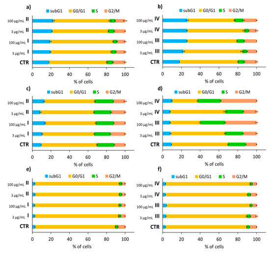 NHDF (a,b), HaCaT (c,d), and Me45 (e,f) cell cycles after carrier solution application at concentrations of 3 µg/mL or 100 µg/mL, followed by a 72 h incubation and compared to untreated control cells (CTR), where subG1—dead cells, G0/G1—mononuclear cells, S—DNA replication, G2/M—mitosis. Means ± S.D. from three independent experiments.