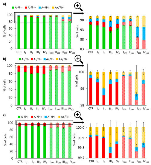 Results of Annexin V/PI double staining apoptosis assay in NHDF (a), HaCaT (b), and Me45 (c) cells after carrier solution additions at concentrations of 3 µg/mL and 100 μg/mL, followed by 72 h of incubation, where A−/PI−: live cells; A−/PI+: necrosis; A+/PI−: early apoptosis; A+/PI+: late apoptosis; 3—3 µg/mL, 100—100 µg/mL. Means ± S.D. from three independent experiments.