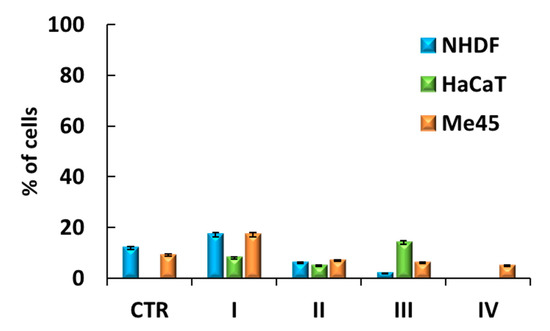 An in vitro evaluation of NHDF, HaCaT, and Me45 model cell lines showed an almost non-toxic effect on human dermal fibroblasts and epidermis, as well as melanoma cells. A cytometric evaluation revealed the effect of the tested carriers with active substances (micelles and conjugates) did not significantly alter the cell cycle phase distribution compared to the untreated control populations of NHDF (Figure 7a,b) or HaCaT cells (Figure 7c,d). NHDF cells were more sensitive to conjugates (III, IV) than to micelles (I, II), and showed a slightly elevated sub-G1 cellular fraction following treatment for 72 h (Figure 7b), regardless of the applied concentration (3 µg/mL vs. 100 µg/mL). However, this increase was insignificant because it was not above 10% compared with control cells. Higher concentrations of the conjugate solution applied to HaCaT cells promoted cell division, which was indicated by a large proportion of cells whose DNA levels doubled (in the G2/M phase) (Figure 7d, Table S2). Cell cycle studies were also performed comparatively on one cancer cell line—Me45. Melanoma Me45 cells were arrested in the G0/G1 phase, which may suggest the cytostatic potential of the active substances released from carriers (Figure 7e,f, Table S3). Although MTT tests did not show a decrease in Me45 cell viability, the use of a micelle solution or conjugate with an active substance may cause arrested the cell cycle and slowed down cell proliferation, which is desirable from a cancer therapy point of view.