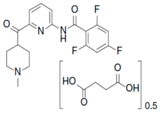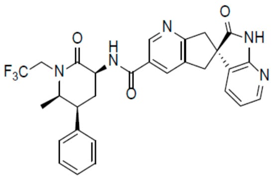 The chemical name of ubrogepant is (3′S)-N-((3S,5S,6R)-6-methyl-2-oxo-5-phenyl-1-(2,2,2-trifluoroethyl)piperidin-3-yl)-2′-oxo-1′,2′,5,7-tetrahydrospiro[cyclopenta[b]pyridine-6,3′-pyrrolo [2,3-b]pyridine]-3-carboxamide [52] and has the following structural formula (Figure 2):