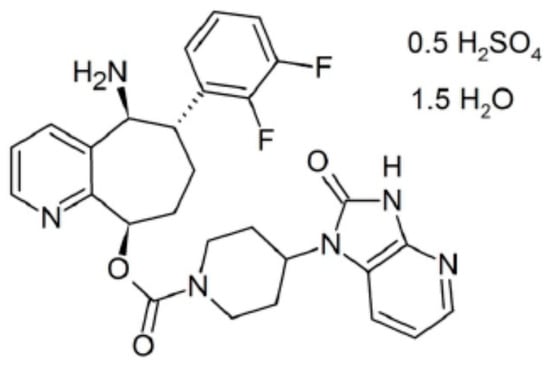 The second FDA-registered gepant (in February 2020) for use in adult patients in acute treatment of migraine with or without aura was rimegepant (NURTEC ODT, 75 mg the orally disintegrating tablet) [69,70]. Rimegepant sulfate is described chemically as (5S,6S,9R)-5-amino-6-(2,3-difluorophenyl)-6,7,8,9-tetrahydro-5H-cyclohepta[b]pyridine-9-yl 4-(2-oxo-2,3H-imidazo[4,5-b]pyridin-1-yl)piperidine-1-carboxylate [70]. Its chemical structure is presented in Figure 3. NURTEC ODT should be taken on or under the tongue; the recommended dose is 75 mg taken as needed, with a maximum dose of 75 mg over a 24 h period [69,70]. Currently, it is the first and only CGRP receptor antagonist available in the form of orally disintegrating tablets intended for acute treatment of migraine and the only oral CGRP receptor antagonist with effect lasting up to 48 h after a single dose [70].