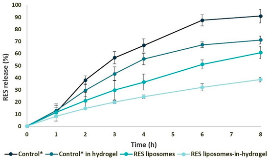 Sustained in vitro resveratrol (RES) release (n = 3). RES release from liposomes and liposomes-in-hydrogel compared to the respective controls, assessed by a spiral release system for 8 h. Results are expressed as percentage mean ± SD. * RES in propylene glycol.