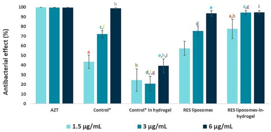 Based on optimal texture properties of liposomes-in-hydrogel for vaginal application [8], RES liposomes (20%, w/w) were incorporated into chitosan hydrogel with a final polymer concentration of 2.5% (w/w). To assure that RES was indeed available to exhibit antimicrobial action, both formulated as RES liposomes or as RES liposomes-in-hydrogel, the in vitro RES release from RES liposomes and RES liposomes-in-hydrogel formulation was compared to the amount of RES from solution (control; RES in propylene glycol) permeating the membrane. To deal with the very limited solubility of RES in water, for RES in solution we used propylene glycol as a solvent to produce the control solution. We were aware that propylene glycol may induce the osmotic effects resulting in enhanced permeation, however, the option of solvents was limited. The amount of RES permeating the membrane, reflecting the RES released from formulations, was measured for up to 8 h considering the overnight application; for the control (free RES), more than 90% (>3050 µg) of RES permeated the membrane as compared to 38% (1300 µg) RES released from RES liposomes-in-hydrogel. Furthermore, the RES release from RES liposomes and RES in hydrogel was measured. After 8 h, more than 70% (>2400 µg) of RES was released from the RES hydrogel, while 61% (2050 µg) of liposomal RES was released. These results correspond to earlier findings assessed in another experimental setup, namely the Franz diffusion cell system [8]. Both liposomal and hydrogel formulations exhibited a sustained RES release that was further enhanced by the combination of the two delivery systems (p < 0.005), providing a prolonged release and probable prolonged effect (Figure 1).