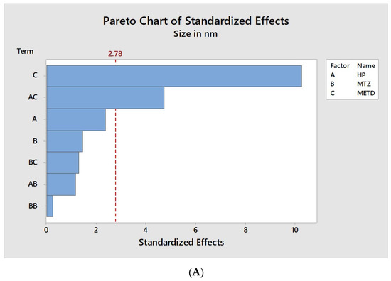 Graphic representation of factor influences on average size of particles. (A) Standardized Pareto chart estimating the effect of mass ratio HP, mass ratio MT, method, and their interaction on the size of the particles. The red dashed vertical line represents the 0.05 critical value for ANOVA. All bars extending to the right of this line indicate that the effects are statistically significant at 5% significance level. (B) Isolated analysis of the factors, HP/MT concentration, and method (on X-axis), and their influence on the size of the nanoparticles (on Y-axis).
