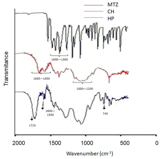 In order to evaluate the polymer–polymer and polymer–drug interactions, the Fourier transform infrared spectroscopy was performed for the free polymers (CS, HP) and drug (MT). For the load and free nano PECs analyses, the dispersion was previously lyophilized during 24 h (Micro Module 115, Thermo). The test was performed on a Bruker spectrometer Vertex 70 (Billerica, MA, USA) and ATR accessory, by the attenuated total reflection method (diamond crystal). For each sample 64 scans were recorded, between 4000 and 400 cm−1.