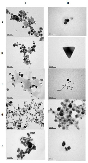 TEM images of (a) dittany, (b) sea buckthorn, (c) sage, (d) calendula, and (e) NaBH4 AgNPs observed under × 200,000 (I) or × 500,000 (II) magnitude. Bar represents 100 nm (I) and 50 nm (II).