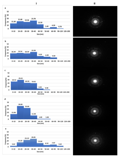 Size distribution obtained by TEM image analysis (I) and selected area (electron) diffraction (SAED) patterns (II) of dittany (a), sage (b), sea buckthorn (c), calendula (d), and NaBH4 AgNPs (e).