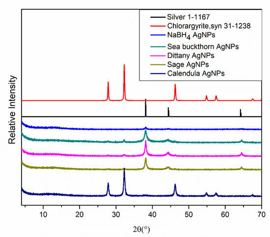 XRD was used to determine the crystalline nature of the AgNPs. The main peaks at (2θ) 38.13, 44.32, and 64.58 that correspond to (111), (200), and (220) planes respectively were present on the XRD patterns of dittany, sage, sea buckthorn, and NaBH4 AgNPs indicating similarity of their crystalline structure (Figure 3). On the contrary, the XRD pattern of calendula AgNPs indicates the presence of AgCl due to the characteristic peaks at (2θ) 46.22 and 54.91 that correspond to (220) and (222) planes of AgCl crystals. Based on this observation, it was concluded that when calendula was used, the main constituent of the sample was AgCl and only a low amount of AgNPs were synthesized. The XRD pattern of the calendula AgNPs is also confirmed [29]. These results were in accordance with the ones obtained from the SAED patterns study.