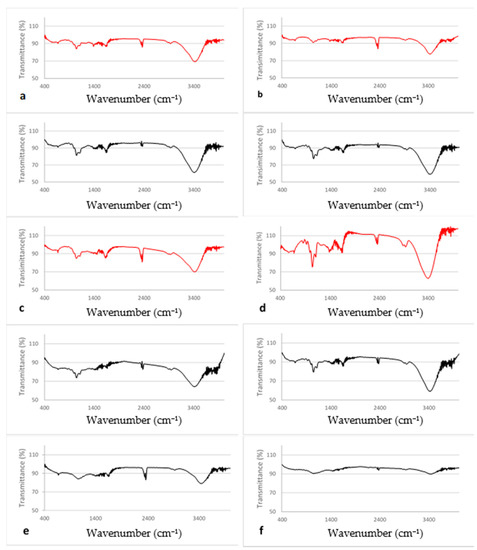 FTΙR spectra of (a–d) extract AgNPs (-) and extract absorbed on active carbon (-) for (a) dittany, (b) sage, (c) sea buckthorn, (d) calendula, (e) NaBH4 AgNPs, and (f) active carbon.