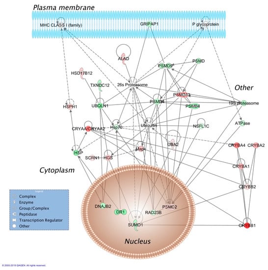 Molecular interaction network associated with development disorder, ophthalmic disease, organismal injury, and abnormalities assembled from retina proteins impacted by E2 given in eye drops to OVX rats. See explanation of shapes, colors and lines in the legend of Figure 1. Abbreviations: ALAD, aminolevulinate dehydratase; ATPase, adenosine triphosphatase; CRYAA/CRYAA2, α-crystallin A/A2; CRYBA1, CRYBA2, CRYBA4, CRYBB1, and CRYBB2, β-crystallin A1, A2, A4, B1 and B2; DNAJ32, DnaJ heat shock protein family (Hsp40) member B2; DR1, down regulator of transcription 1; GRIPA1, glutamate receptor-interacting protein associated protein 1; HGS, hepatocyte growth factor-regulated tyrosine kinase substrate; HSD17B12, hydroxysteroid 17-β dehydrogenase 12; HSP, heat shock protein; Hsp70, heat shock protein 70; HSPH1, heat shock protein family H (Hsp110) member 1; NSFL1C, N-ethylmaleimide-sensitive factor L1 cofactor; PSMB4, proteasome subunit-β 4; PSMC2, proteasome 26S subunit, non-ATPase 2; PSMD, proteasome 26S subunit, non-ATPase; PSMD4, PSMD9 and PSMD13, proteasome 26S subunit, non-ATPase 4, 9 and 13; RAD23B, nucleotide excision protein RAD23 homolog B; SCRN1, secernin 1; SUMO1, small ubiquitin-like modifier 1; TXNDC12, thioredoxin domain containing 12; UBA2, ubiquitin-like modifier activating enzyme 2; UBQLN1, ubiquilin 1.