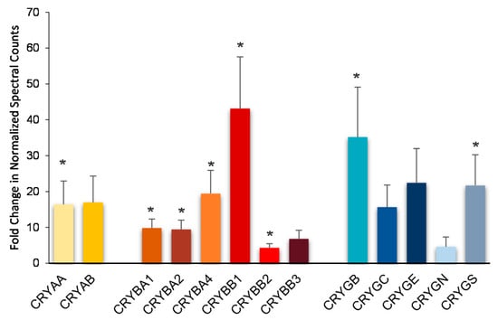 Upregulation of all crystallins was detected using normalized MS/MS spectral counts (SC) as quantitative measures in the retina of OVX rats after treatment with E2 given in eye drops. Fold changes are displayed as averages ± standard error (n = 5/group). Asterisks (*) indicate statistically significant differences of SC between treatment as control using unpaired t-tests.