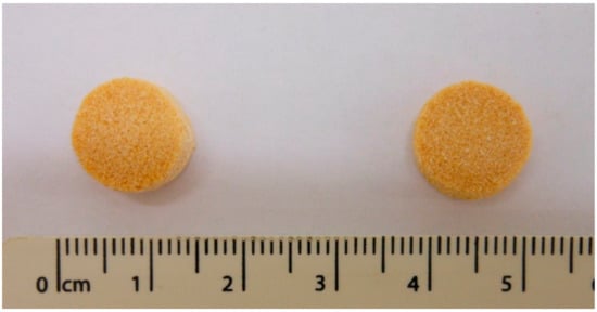 The disintegration time of the printlets was determined using the compendial disintegration equipment. The printlets completely disintegrated in around 15 s (Table 2), which agrees with the dissolution profiles. The disintegration times are in line with the values of the commercial formulation (14.3 ± 2.7 s). As the disintegration time is lower than 30 s, these printlets would be considered ODTs according to the European Pharmacopoeia and the FDA.
