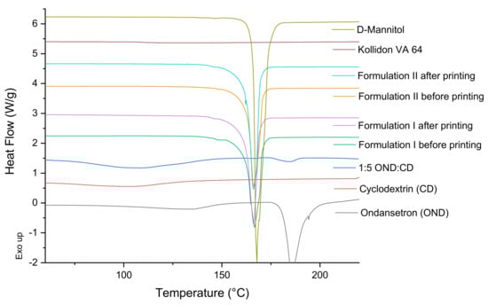 DSC and X-ray studies of the individual components of the formulations, of 1:5 ondansetron-cyclodextrin complexes, of the mixture of the components before the printing process and of the 3D printed formulations were performed to characterize the state of the drug and how it is incorporated into the 3D printed formulations (Figure 4 and Figure 5).