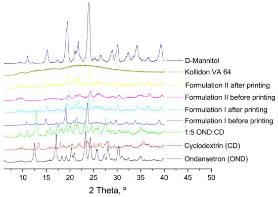 X-ray diffractograms do not provide clear information and cannot be used to confirm the results from the DSC (Figure 5). XRPD patterns of the individual components show that mannitol and the drug-cyclodextrin complexes have some peaks corresponding to crystalline forms. Kollidon VA 64 showed wide halos indicative of the amorphous form. Crystalline ondansetron peaks are not observed in the drug-cyclodextrin complexes incorporated into the formulations due to the crystallinity of mannitol. XRPD patterns of the formulations both before and after printing showed sharp peaks which are indicative of a crystalline form of mannitol but do not provide useful information about the state of the drug and how it is incorporated into the polymers.