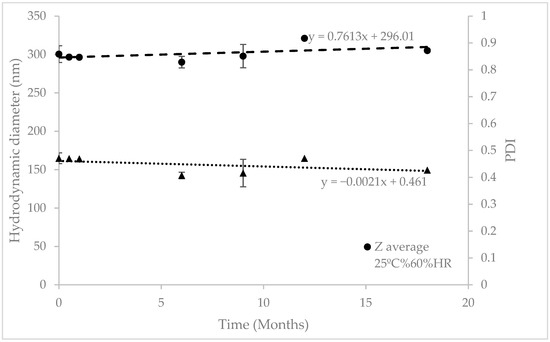 Stability studies at 25 ± 2 °C/60% ± 5% Relative Humidity (HR) over 18 months. RP-loaded transfersomes’ hydrodynamic diameter and polydispersity index, monitored over time.