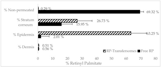 Figure 4 shows the penetration profile of RP from transfersomes and control (free RP solution in MCT) formulations in the different skin layers. Mass balance ranged between 90%–110% recovery in both cases.
