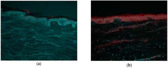 Fluorescence microscopy images of pig-ear skin cross-section. Red color corresponds to Nile red fluorescence and blue to Hoeschst staining of the cell nucleus. (a) Not vehiculized nile red control (image J, mean epidermis intensity 7846 ± 140 AU); (b) Nile red-marked transfersomes (image J, mean epidermis intensity 12,428 ± 254 AU). The images were captured using 10× magnifications