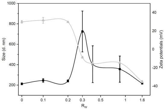 NP concentration is a key factor in cellular experiments, as it is directly correlated to the sample administration volume. Indeed, administration of large sample volumes have been reported to negatively interfere with cellular survival, challenging the osmotic equilibrium of the cell membrane [27]. With respect to previous investigations [1,5], here GOCL NPs were prepared at higher concentrations that allowed us to use a lower administration sample volume, thus, minimising unwanted effects on cell cultures. Since concentration may affect the aggregation state of colloidal systems, a preliminary characterisation was performed to evaluate size and zeta-potential of GOCL NPs. DLS and microelectrophoresis measurements showed that GOCL NPs had optimal physicochemical properties for gene delivery purposes, as they were small in size (212.3 ± 9.1 nm, diameter) and positively charged (zeta-potential = 30.0 ± 1.5 mV) (data not reported for space consideration). It is well-known that the DNA/CL weight ratio (Rw) is a key factor affecting CL-based gene delivery [28,29]. As a consequence, we first characterised size and zeta-potential of grapholipoplexes as a function of Rw. Figure 1 shows that grapholipoplexes undergo re-entrant condensation and charge inversion [30].