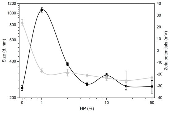 Following exposure to biological media, the physicochemical properties of NPs are largely altered [15]. Thus, we explored the effect of protein concentration on size and zeta-potential of grapholipoplexes. In accordance with previous literature [32], biocoronated grapholipoplexes showed a significant increase in size and a rapid inversion of zeta-potential from positive to negative values (Figure 2). Since plasma proteins are mainly anionic at physiological pH, already with 1% HP, the cationic surface charge of grapholipoplexes is rapidly reversed to negative values (zeta-potential = −17.1 ± 1.8 mV). With the increasing HP concentration, zeta-potential remains at net negative values with minor fluctuations, indicating that complexes are completely covered by plasma proteins and that a further increase of HP concentration does not lead to a further thickening of the corona [17]. A characteristic pattern for size of coronated grapholipoplexes was also observed. At HP = 1%, complexes are large in size, meaning that a rapid particle clustering has occurred as a result of charge neutrality [30]. A further increase of HP concentration results in marked size decrease, until a plateau is reached at around 5% HP exposure.