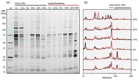 Coronas of GOCL NPs and grapholipoplexes were characterised through 1D SDS-PAGE (a representative gel image is shown in Figure 3a). First, we observed that PC composition of both systems was influenced by protein concentration. To compare coronas of GOCL NPs and grapholipoplexes, 1D normalised protein patterns were calculated (Figure 3b). At low protein concentration (HP < 5%), protein patterns of GOCL NPs and grapholipoplexes were almost superimposable. On the other side, at high protein concentration (HP < 20%), marked differences in the protein profiles of GOCL NPs and grapholipoplexes were found. Bearing in mind that plasma proteins are largely negatively charged at physiological pH, our findings suggest that, at low protein concentration, they preferentially bind to the lipid surface of grapholipoplexes. Subsequently, once the lipid surface of grapholipoplexes is fully saturated by protein, less-abundant acidic plasma proteins bind to negatively charged plasmids located at the particle surface [33].