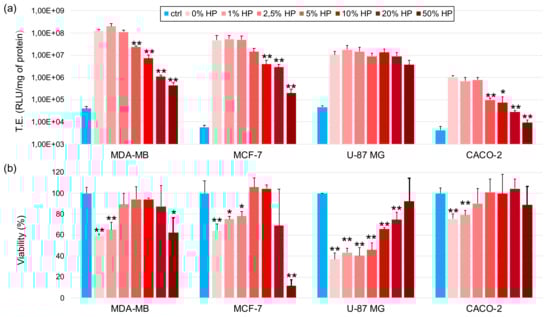 Transfection efficiency (TE, panel a) and cell viability (panel b) of biocoronated grapholipoplexes at different plasma concentrations in MDA-MB, MCF-7, U-87 MG and CACO-2 cells. Untreated cells (blue bars) were used as a control (ctrl) in both experiments. Results are given as average of six independent measurements ± S.D. Statistical significance was evaluated using Student’s t-test (* p < 0.05; ** p < 0.01; no asterisk means lack of significance) with respect to pristine grapholipoplexes (i.e., 0% HP) and untreated cells in TE and cell viability experiments, respectively.