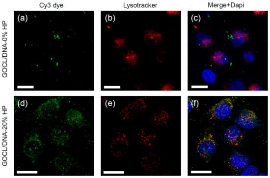It has been demonstrated the formation of PC provides a capacity to alter both cellular and intracellular location of nanoparticles [45,46,47]. Among intracellular final destinations, lysosomes are an undesirable option. Indeed, degradation of gene delivery systems in lysosomal compartment is one of the most relevant bottlenecks of efficient transfection [48,49]. Therefore, the final fate of fluorescently-labelled grapholipoplexes (green) was investigated next.