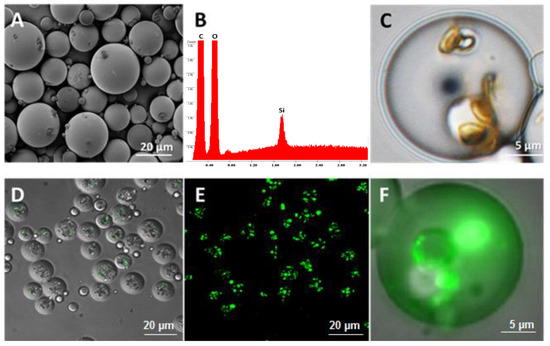 The PLGA-MSVs were characterized by SEM-energy-dispersive X-ray (EDX) and confocal microscopy. SEM images show that the spherical-shaped PLGA-MSVs with smooth surfaces had a wide distribution from a few microns to approximately 50 μm, with an average diameter of 23 ± 3 (n = 50; Figure 1A). EDX spectrum showed the presence of a Si peak (Figure 1B), which indicates the presence of MSV particles inside of the PLGA microspheres. The full encapsulation of MSV was further confirmed by optical microscopy, where hemispherical MSVs appeared yellow in color (Figure 1C). MSVs were also loaded with a reporter protein (FITC-BSA) and imaged by confocal microscopy. Imaging clearly demonstrated that the FITC-BSA loaded MSVs (in green) were fully encapsulated (Figure 1D–F).