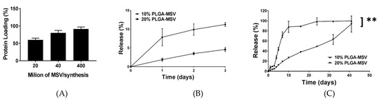 The in vitro loading and release profiles of BMP-2 using PLGA-MSV microspheres (10%, 20% w/v; n = 3). (A) The loading profiles of BMP-2 into MSV particles with fixed BMP-2 concentrations and mass, and varied MSV microparticle number. Cumulative release profile of BMP-2 from different 10% and 20% PLGA-MSV in the first three days (B) and over 41 days, (C). Values are reported as mean ± standard deviation. A value of p < 0.05 was considered statistically significant: ** p < 0.01 (calculated by t test analysis).