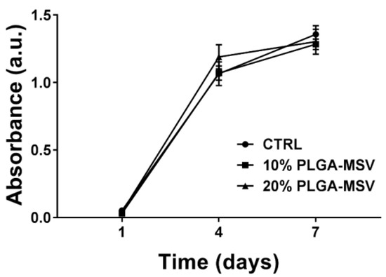MTT assay for rat bone marrow stromal cells (BM-MSCs) cultured with 10% PLGA-MSV and 20% PLGA-MSV microspheres over 7 days (n = 3). Cell viability is reported as absorbance at 490 nm. The cell metabolic activity of BM-MSCs in the presence of both formulations of PLGA-MSV was comparable to that of untreated cells (CTRL). Values are reported as mean ± standard deviation. No statistical significance was found among selected experimental conditions.
