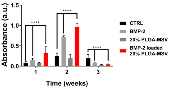 Osteogenic differentiation was measured by ALP activity, a biomarker of osteoblastic differentiation. The assay was carried out according to manufacturer guidelines for the spectrophotometric procedure using ALP reagent (Vector Laboratories, Inc. Burlingame, CA, USA). The BM-MSCs were plated into a 24 well cell culture plate at a density of 2500 cells per well with the PLGA-MSV microspheres (20% w/v) loaded with BMP-2 was used as the experiential group. Cells alone, cells cultured with BMP-2, and empty PLGA-MSV microspheres without BMP-2 (20% w/v) were used as controls. Cell culture media was changed every 3 days. Cells were cultured in α-minimum essential medium (αMEM; Invitrogen) supplemented with 10% (v/v) fetal calf serum (Invitrogen), 100 U/mL penicillin, and 100 μg/mL streptomycin (Invitrogen) as the standard growth media. Culture conditions were 37 °C in a humidified 5% CO2 atmosphere. The osteogenic growth media included 10 mM β-glycerophosphate, 0.1 mM ascorbate-2-phosphate, and 100 nM dexamethasone. Cell culture media was replenished twice weekly. Cells were cultured in standard media until 60% confluence and then switched to osteogenic media. ALP assays were performed at week 1, 2, and 3. The medium was aspirated and 1 mL of PBS was added into each well to wash the cells. Cells were washed 3 times with PBS, and fixed in 10% buffered formalin for 15 min. Cells were then washed twice in deionized (DI) water and covered in ALP stain made fresh. ALP staining stock solution was made from ALP substrate kit III (Vector Laboratories. Inc., Burlingame, CA, USA) into 5 mL of 100 mM tris-HCl (pH = 8.2) solution. Absorbance of cells after staining was used to quantify ALP activity. The experiments were performed in triplicate.