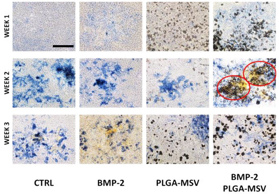 ALP and Von Kossa co-staining of BM-MSCs and BM-MSCs with experimental groups. ALP activities increased from week 1 to week 2 and then decreased from week 2 to week 3 in BMP2 and BMP2-PLGA-MSV. The cells in the presence of the PLGA-MSV-BMP-2 microspheres at week 2 showed the strongest ALP activity (red circles) among all of the control and experimental groups over the 3-week culture period. Von Kossa staining progressively increased in all groups with BMP2 and BMP2-PLGA-MSV showing the most staining at week 3 (Scale bar: 60 μm).