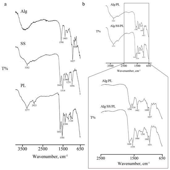 Fourier transform infrared (FTIR) spectroscopy. The analysis was performed on single components (SS, PL and Alg) (a) and biomembranes (b) The IR spectra where obtained in the spectral region of 4000–650 cm−1.